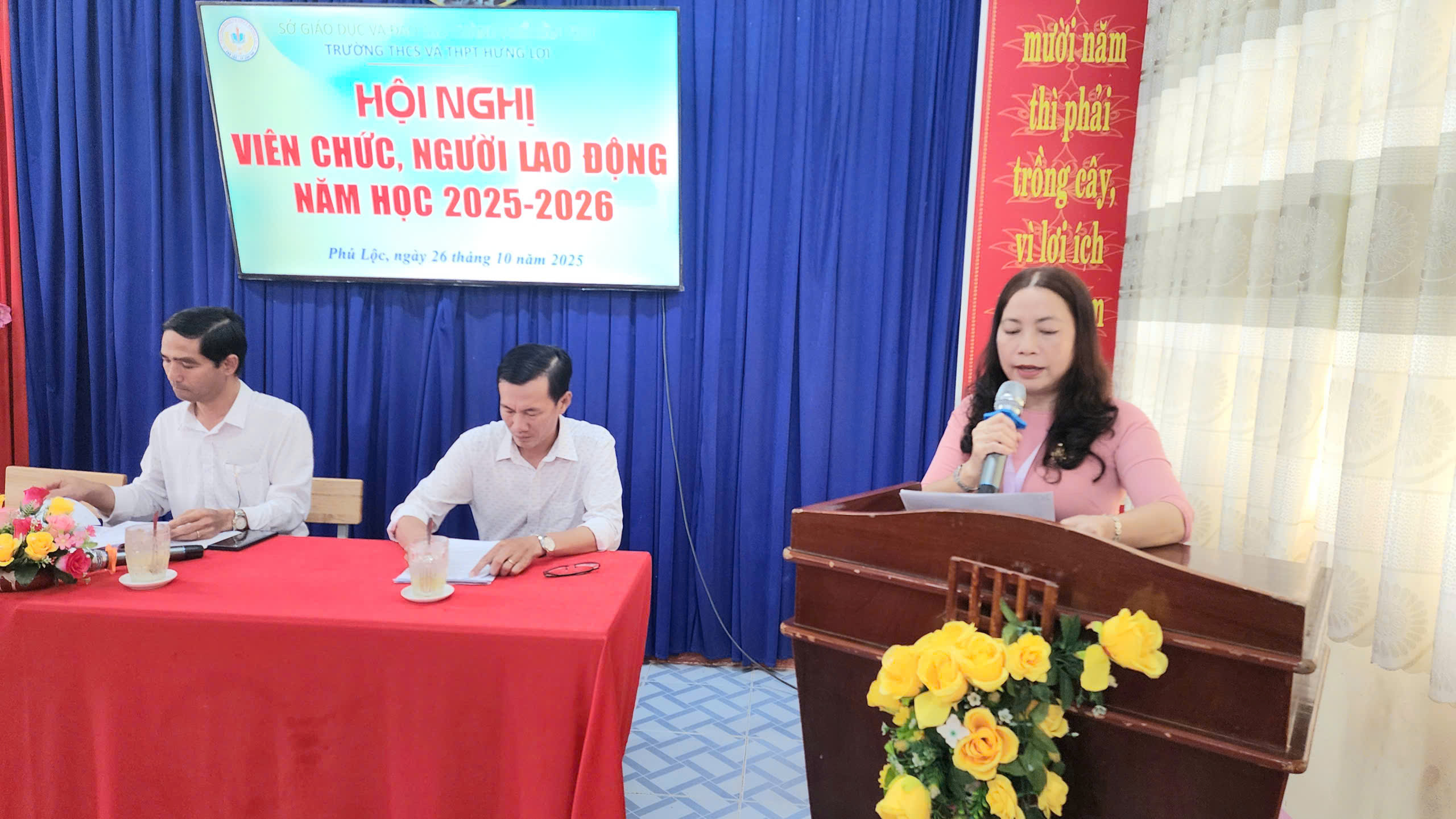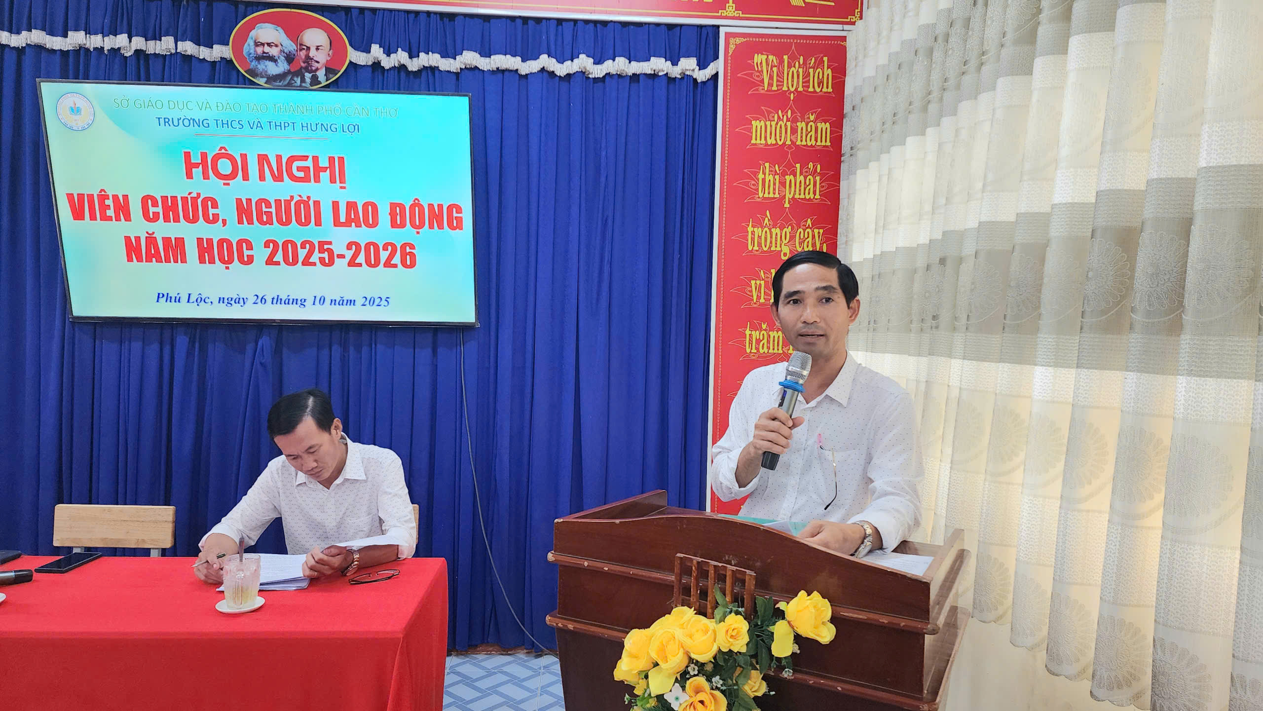 Thực hiện Công văn số 2449/SGDĐT-TCCB ngày 21/10/2025 của Sở Giáo dục và Đào tạo thành phố Cần Thơ về việc tổ chức Hội nghị viên chức, người lao động trong các cơ sở giáo dục công lập, chiều ngày 26/10/2025, Trường THCS và THPT Hưng Lợi đã long trọng tổ chức Hội nghị viên chức, người lao động năm học 2025–2026.